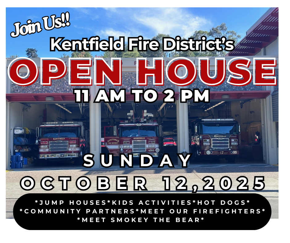 Join Us! Kentfield Fire District's Open House Saturday, October 12, 2024 10 AM to 2 PM * Bouncy House * Kids Activities * Hot Dogs * Community Partners * Smokey the Bear * Meet our Firefighters ...